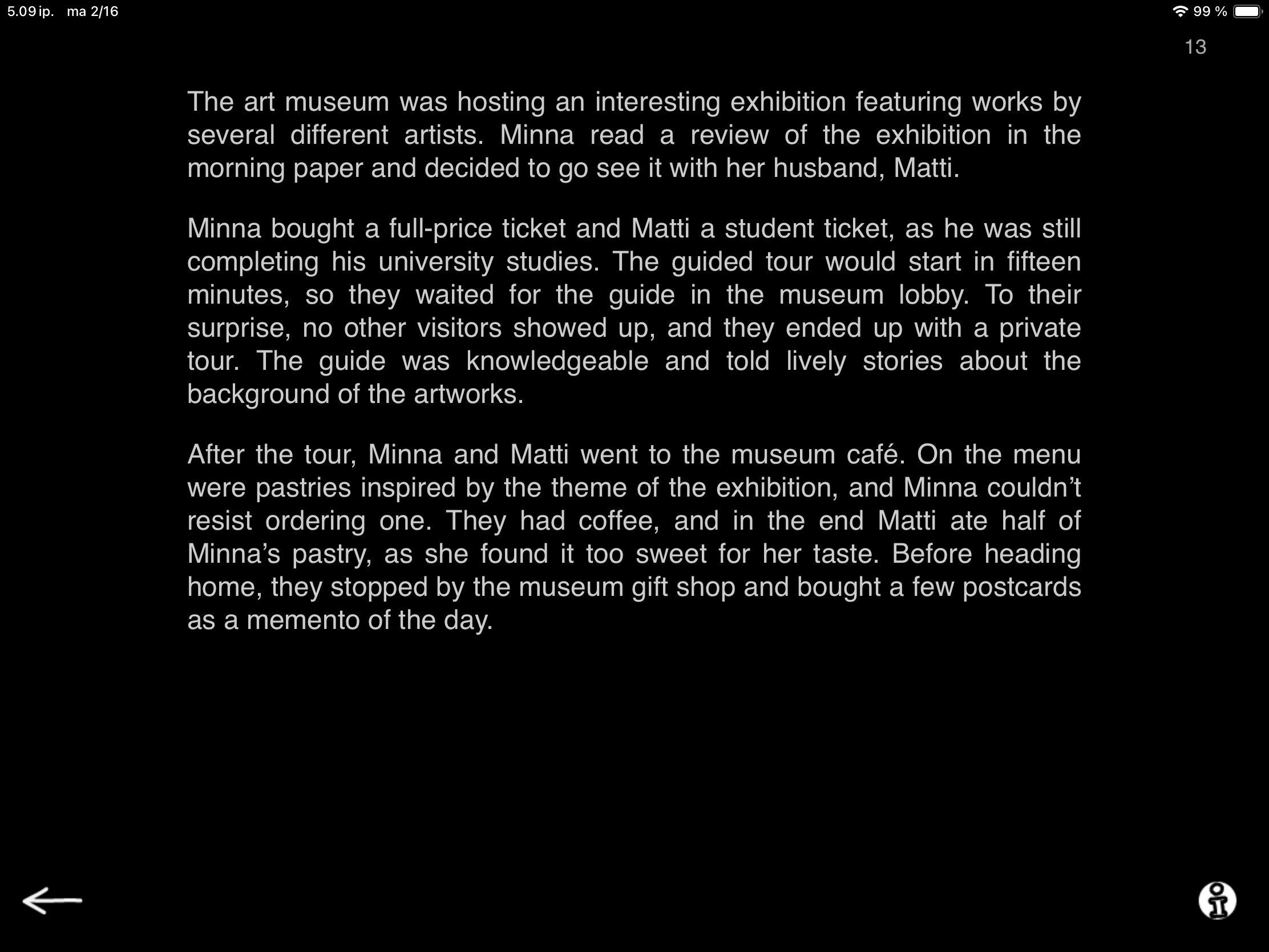 Synopsis has two levels reflecting two text styles. Level 1 has stories about people in everyday situations. In the example on the left, Minna and Matti are paying a visit to the museum.