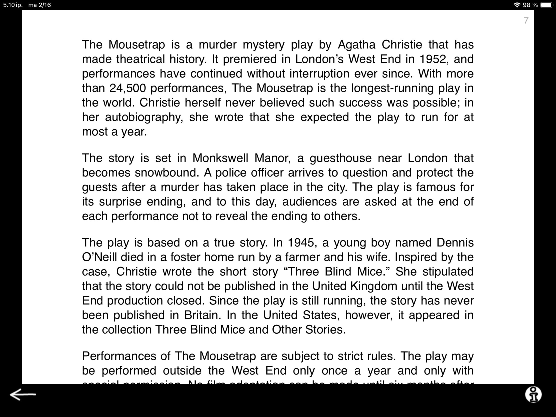 Level 2 consists of factual texts similar to short magazine articles. Here the text talks about the (super fun!) play The Mousetrap by Agatha Christie.