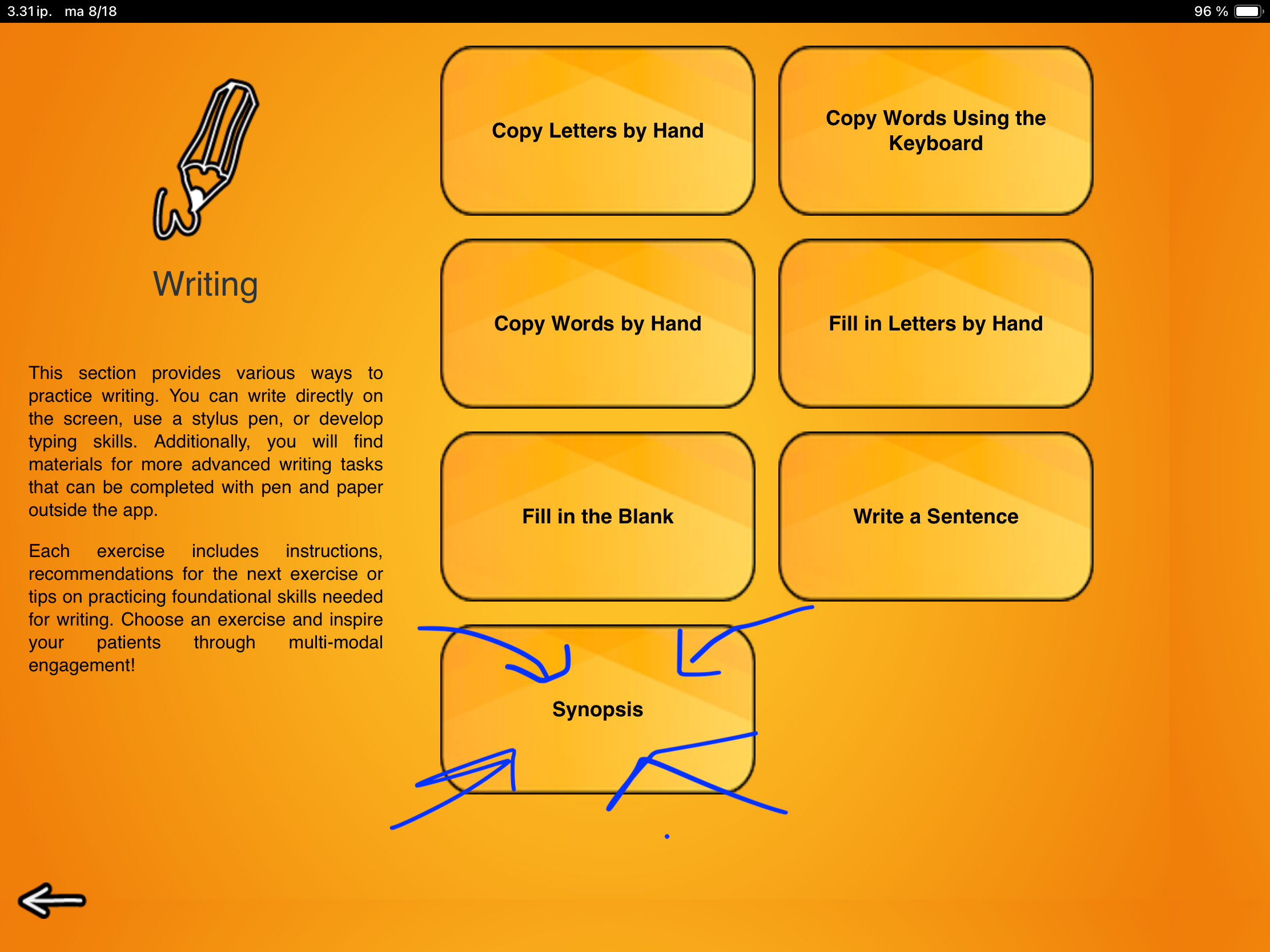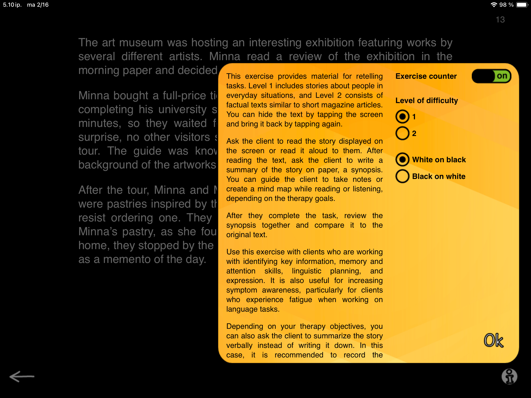 When you open Synopsis on your iPad, a story appears on screen. Ask the patient to read it and write a summary of the story on paper, i.e., create a synopsis. Guide the patient to take notes or create a mind map while reading, to support forming a coherent overview. You can hide the text by tapping the screen and bring it back by tapping again.